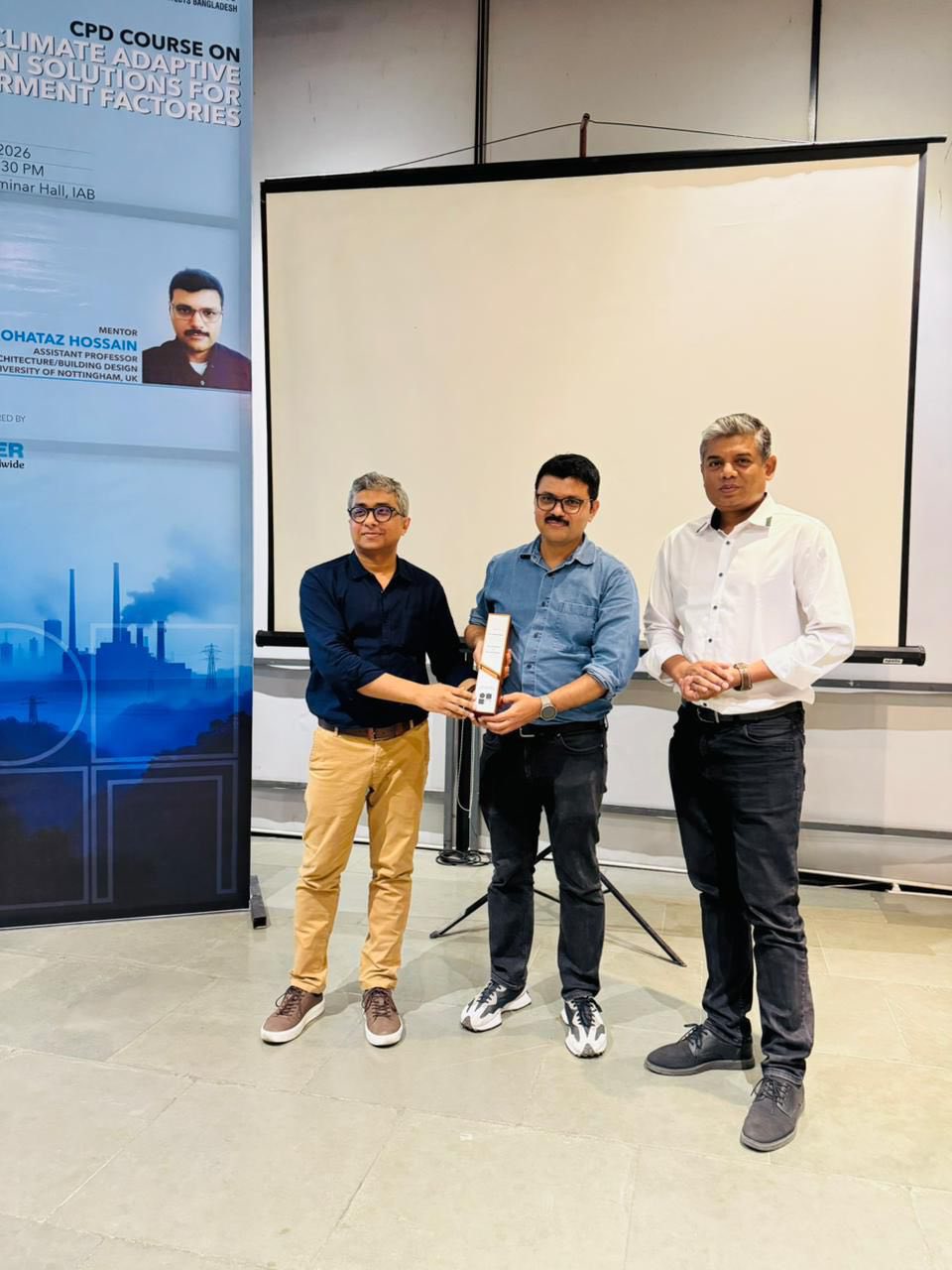 এই CPD কোর্সে প্রধান মেন্টর ও বক্তা হিসেবে উপস্থিত ছিলেন ড. মোহতাজ হোসেন, অ্যাসিস্ট্যান্ট প্রফেসর, সাস্টেইনেবল আর্কিটেকচার/বিল্ডিং ডিজাইন, ইউনিভার্সিটি অব নটিংহ্যাম, যুক্তরাজ্য। তিনি গার্মেন্টস কারখানার জন্য জলবায়ু-উপযোগী নকশা কৌশল, তাপমাত্রা নিয়ন্ত্রণ, প্রাকৃতিক বায়ু চলাচল, ডেলাইটিং, শক্তি দক্ষতা এবং শ্রমিকদের স্বাস্থ্য ও উৎপাদনশীলতার সাথে নকশার সম্পর্ক নিয়ে বিস্তারিত আলোচনা করেন। পাশাপাশি গরম ও আর্দ্র জলবায়ুতে উপযোগী ভবন নকশা, প্যাসিভ ডিজাইন স্ট্রাটেজি, ফ্যাসাড ট্রিটমেন্ট, রুফ ডিজাইন, থার্মাল পারফরম্যান্স এবং টেকসই নির্মাণ উপকরণের ব্যবহার নিয়ে গবেষণাভিত্তিক দৃষ্টিভঙ্গি উপস্থাপন করা হয়।