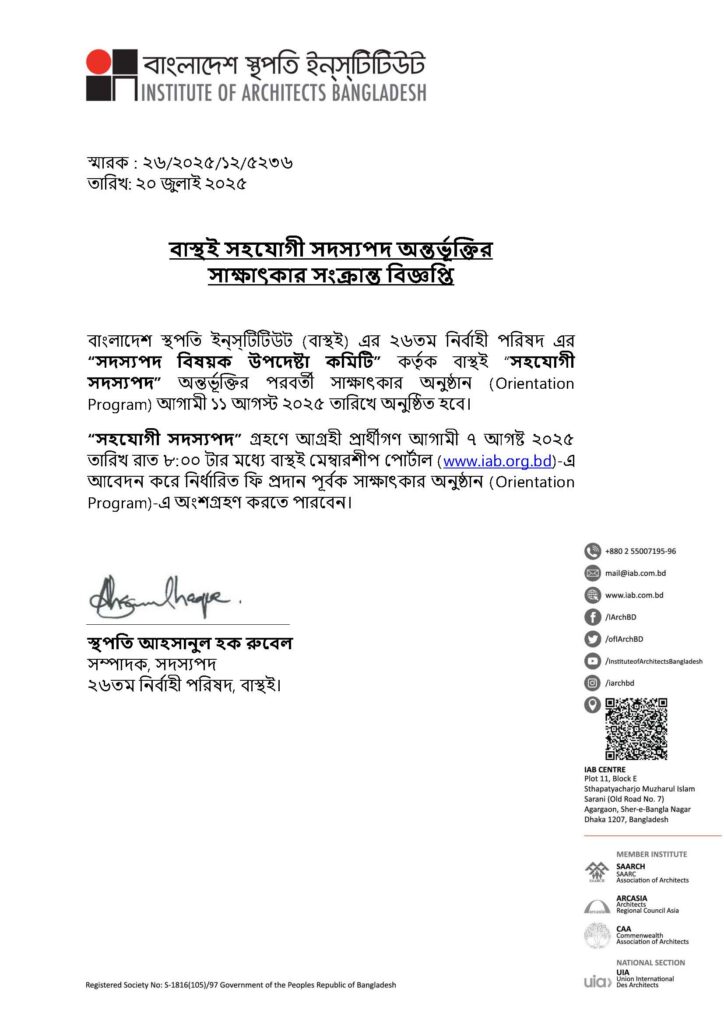 বাংলাদেশ স্থপতি ইন্স্টিটিউট (বাস্থই) এর ২৬তম নির্বাহী পরিষদ এর “সদস্যপদ বিষয়ক উপদেষ্টা কমিটি” কর্তৃক বাস্থই “সদস্যপদ” অন্তর্ভূক্তির পরবর্তী পরীক্ষা (Cycle-4) কার্যক্রমের সময়সূচি নিম্নোক্তভাবে নির্ধারণ করা হয়েছে: পরীক্ষার প্রস্তুতি কর্মশালা (Exam […]
