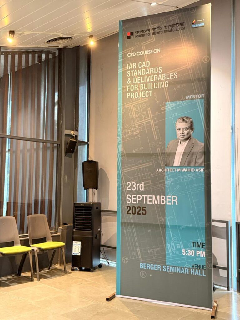 গত ২৩ সেপ্টেম্বর ২০২৫, মঙ্গলবার, বিকেল ৫:৩০ টা থেকে রাত ৯:৩০ টা পর্যন্ত ইনস্টিটিউট অব আর্কিটেক্টস বাংলাদেশ (বাস্থই) এর বার্জার সেমিনার হলে অনুষ্ঠিত হয় “IAB CAD Standards & Deliverables for Building Project” শীর্ষক একটি গুরুত্বপূর্ণ CPD (Continuing Professional Development) সেশন। সেশনে নিবন্ধিত স্থপতিদের মধ্য থেকে মোট ৯১ জন সদস্য অংশগ্রহণ করেন। অংশগ্রহণকারীরা সরাসরি অভিজ্ঞতা বিনিময় এবং সে বিষয়ে বাস্তব উদাহরণসহ ধারণা লাভ করেন।