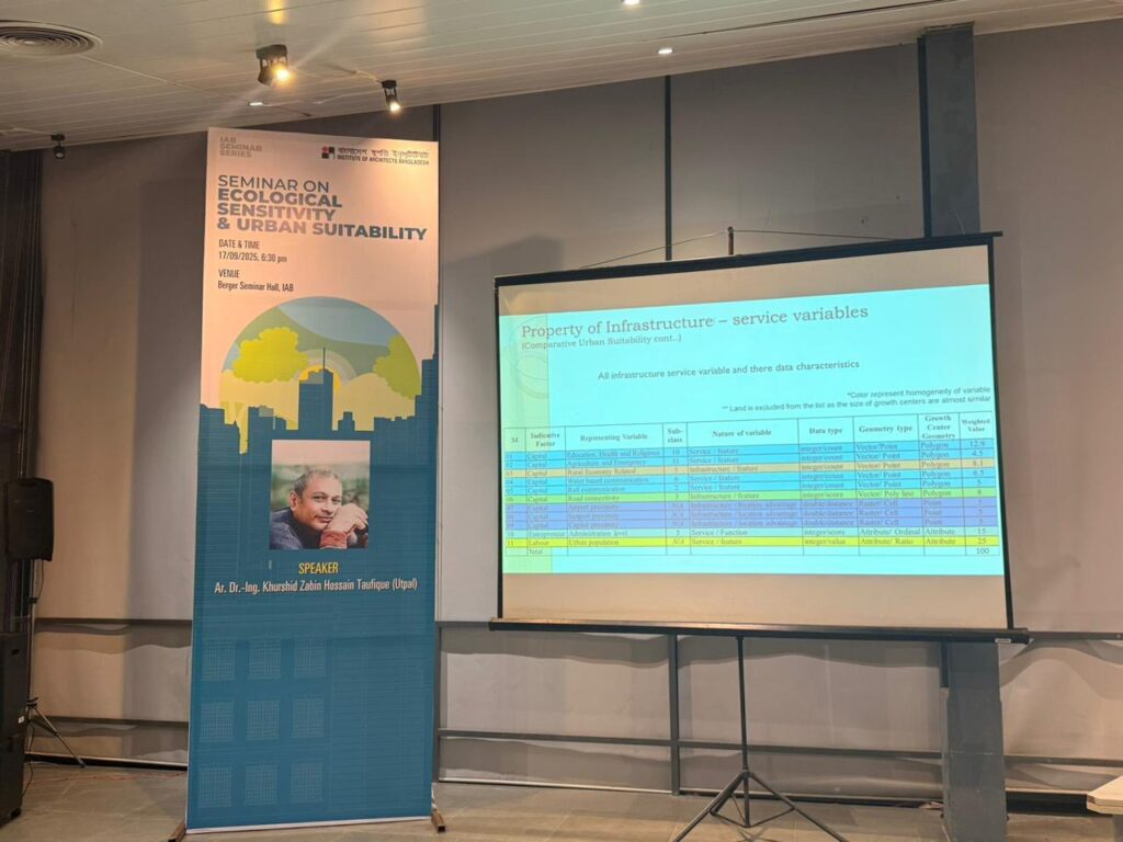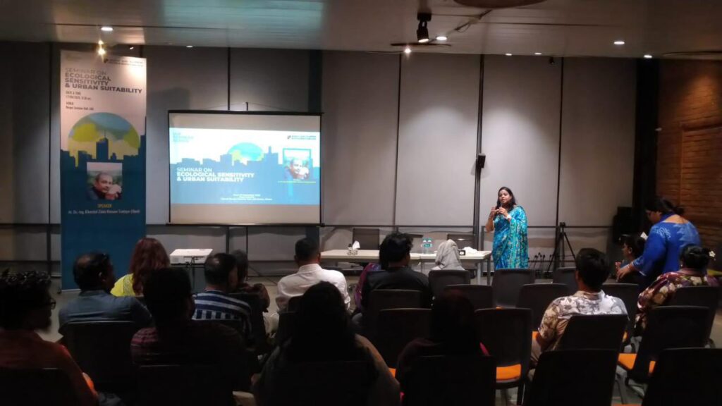গত ১৭ সেপ্টেম্বর ২০২৫, বুধবার, সন্ধ্যা ৬:৩০টা থেকে রাত ৯:১৫টা পর্যন্ত ইনস্টিটিউট অব আর্কিটেক্টস বাংলাদেশ (বাস্থই) এর বার্জার সেমিনার হলে অনুষ্ঠিত হয় “Bangladesh: Ecological Sensitivity & Urban Suitability” শীর্ষক একটি গুরুত্বপূর্ণ সেমিনার। বাংলাদেশের ভৌগোলিক, পরিবেশগত ও নগরায়ণ প্রেক্ষাপটে পরিবেশগত সংবেদনশীলতা এবং টেকসই নগর উপযোগিতার দিকগুলো বিশ্লেষণ ও আলোচনা করার উদ্দেশ্যে এ সেমিনারের আয়োজন করা হয়।