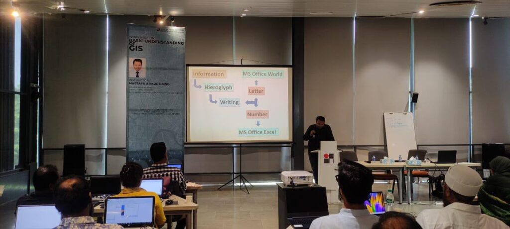 এই কর্মশালার মূল উদ্দেশ্য ছিল অংশগ্রহণকারীদের জিওগ্রাফিক ইনফরমেশন সিস্টেম (GIS) সম্পর্কে মৌলিক ধারণা প্রদান করা এবং এর ব্যবহারিক প্রয়োগ সম্পর্কে দক্ষতা বৃদ্ধি করা। প্রশিক্ষণে অংশগ্রহণকারীরা স্থানিক তথ্য (spatial data) সংগ্রহ, বিশ্লেষণ ও উপস্থাপনার বিভিন্ন পদ্ধতি সম্পর্কে শিখেন। এছাড়া, রিমোট সেন্সিং ডেটা, স্যাটেলাইট ইমেজ বিশ্লেষণ, ম্যাপ প্রজেকশন, ডেটা লেয়ারিং এবং ল্যান্ড ইউজ মডেলিং সম্পর্কেও ব্যবহারিক প্রশিক্ষণ প্রদান করা হয়। কর্মশালায় দেখানো হয় কীভাবে GIS প্রযুক্তি শহর পরিকল্পনা, ভূমি ব্যবস্থাপনা, অবকাঠামো উন্নয়ন, পরিবেশ পর্যবেক্ষণ ও দুর্যোগ ব্যবস্থাপনা-এর মতো বিভিন্ন ক্ষেত্রে কার্যকর ভূমিকা রাখতে পারে। অংশগ্রহণকারীরা হাতে-কলমে অনুশীলনের মাধ্যমে GIS সফটওয়্যারের মৌলিক ফিচার ও বিশ্লেষণ কৌশল আয়ত্ত করার সুযোগ পান। সেশনের শেষভাগে অংশগ্রহণকারীদের প্রাণবন্ত আলোচনা, মতামত এবং সক্রিয় অংশগ্রহণ সেশনের মূল উদ্দেশ্যকে আরও সমৃদ্ধ করে তোলে।